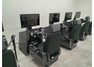 初めてハンドルを握る際の不安を少しでも軽くするための模擬運転装置を使った教習です。画面を見ながら、運転の基本操作を行います。