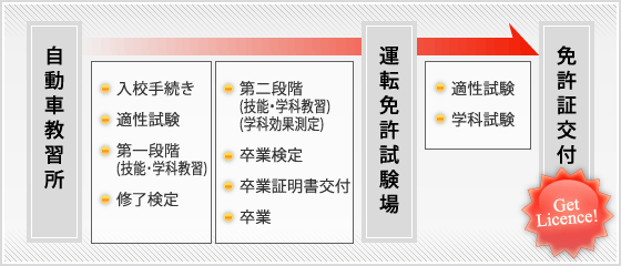 第一段階、第二段階での場内および路上の技能教習で学んだことを確認する総合的な技能の卒業検定です。これに合格すると、卒業証明書が交付され、自動車教習所を卒業です。運転免許試験場での適性試験及び学科試験に合格されますと免許証が交付されます。